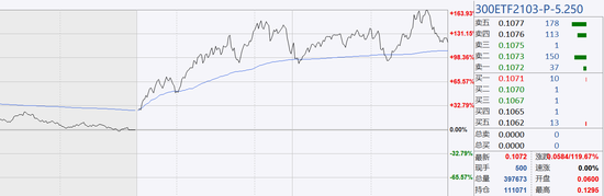 其它300ETF2103认沽期权合约也出现了不同程度的上涨,行权价为5.25的50ETF2103认沽期权合约收涨119.67%。该认沽期权也是当日成交量最大的认沽期权合约,期权成交量为397,673张。当日50ETF2103认沽期权总成交量为885,824张,较上一交易日增加143,608张。