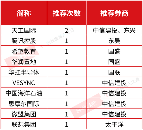 此外,券商3月的金股名单还有一个明显的改变,即或是受港股提高印花税的影响,券商推荐港股的“积极性”并不高。据记者梳理,2月被推荐的港股约有18只,但3月下滑至10只,并且天工国际、腾讯控股、希望教育、思摩尔国际和联想集团等2月的“老面孔”占了一半(见表2)。