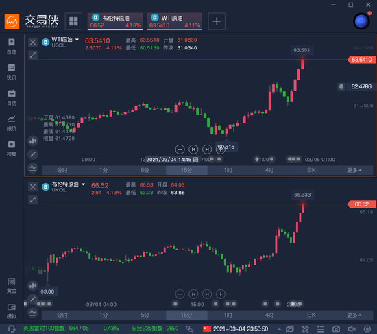两油周四晚间持续走高。截至23:59,布伦特原油期货涨幅扩大至5%;WTI原油期货也站上64美元/桶,日内涨超4%。美股油气板块涨幅扩大,巴西石油公司涨超5%,埃克森美孚石油涨超3%,美股三大指数全部转涨。