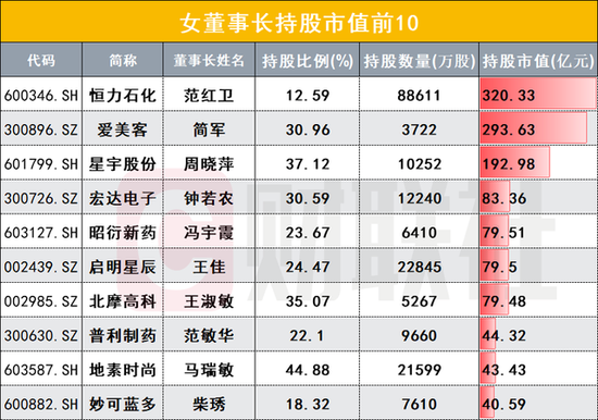 在个人持股方面,按最新收盘价计算,总计有15位A股女董事长所持公司市值超过30亿元。其中,恒力石化范红卫持股市值达320亿元,一举拔得头筹。值得关注的是,作为民营炼化“大哥”,恒力石化近一年来股价累计上涨超146%,此外还在上周被纳入富时中国A50指数。