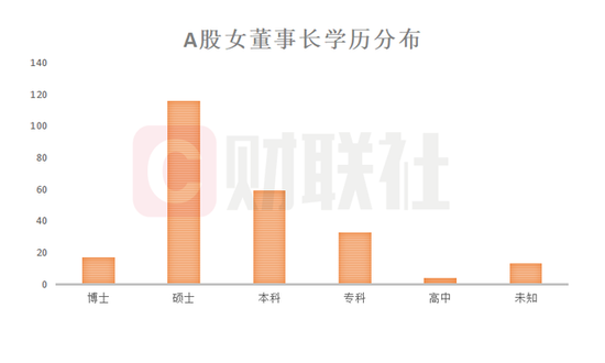从学历分布来看,据财联社统计,在242位女性董事长中,拥有硕士学位的达到116人,占比达47.93%。此外,本科学历的为59人,博士学位的为17人,专科学历以及高中学历分别为33人、4人。