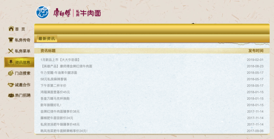 蓝鲸记者在浏览康师傅私房牛肉面官网时注意到,其最新资讯停留在2019年2月初,此后再无更新。而门店数量披露上,也似乎停留在较早以前的数据,未有及时更新。