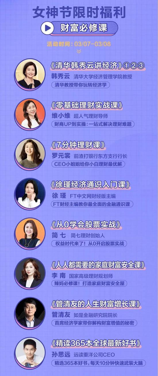 最受欢迎课程《清华韩秀云讲经济》三季八折起;超人气导师维小维教你零基础理财实战课,一站式解决理财难题;还有国家高级理财规划师沈南为你讲授家庭财富安全课,为你的家庭资产保驾护航!…