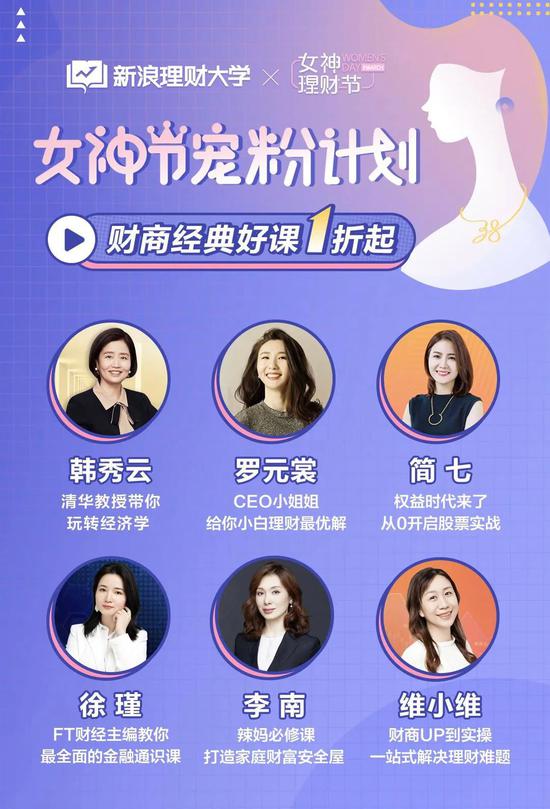 因此,在这个专属于女神的节日,新浪理财大学特别推出女神理财节,甄选超多好礼与好课,从外在基础的投资打理到内在修炼的财商升级,让你既可“貌美如花”,也可赚钱养家,成为名副其实的“财女”,奠定人生底气!