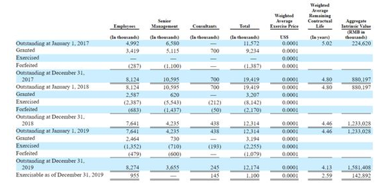 下图为2017年、2018年和2019年各个年度的股票期权活动: