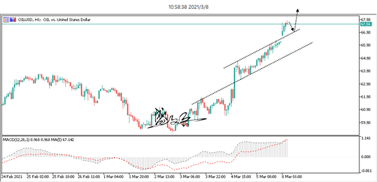 原油,受消息面影响价格继续向上突破,D1级别连续收出阳线,形成了三连阳的K线组合。今天价格跳空高开,预期还将上行一段时间,需要注意的是相对高位的跳空高开,会有回调,所以不要追多。H1级别的MACD指标处于0轴上方极限位置并出现钝化,整体走势出现顺势向上的调整浪,这些信息告诉我们多头占据了绝对优势,短期内会有回落。所以,今天的日内交易思路首先考虑逢低做多,等待价格回落至下方趋势线附近看信号布局多单,目标看上方阻力位置。