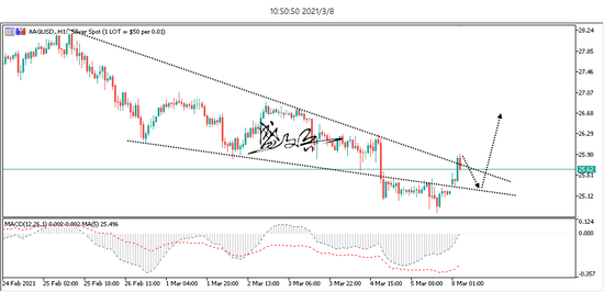 黄金,上周五D1级别收出阳线十字星,整体上属于看涨的孕线反转信号。再从H1级别看分析,MACD快线指标已经突破0轴,慢线指标也开始拐头向上,同时H1级别的价格走势也已经突破下降趋势线的压制,这些信息告诉我们走势有可能会发生转折,现在就看是否会突破前高。所以,今天的日内交易思路,首先考虑逢低做多,等待价格回落到下方趋势线的支撑区间看信号布局多单,目标看上方阻力位置。