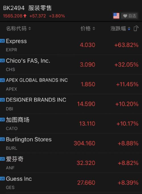 受益于经济重启的服装零售板块也大幅上扬。