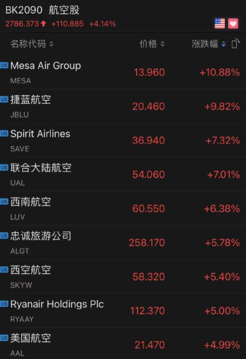 分行业来看,航空板块大涨,捷蓝航空涨8.53%,美国联合航空(UAL.O)涨6.53%,西南航空(LUV.N)涨5.58%。