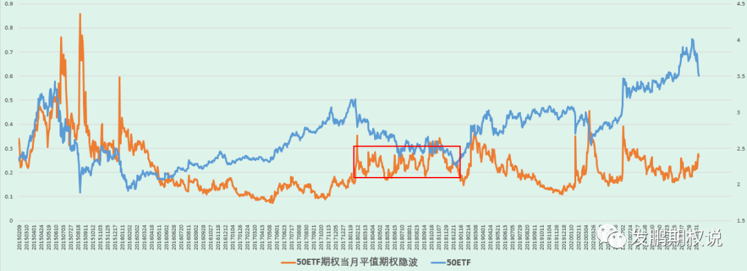 虽然我觉得后续的震荡会比2018年强,但如果非要从历史中找一个参考的行情,感觉是有点像2018年瘟跌行情中,隐波在20%-30%震荡的势头,且看下图红框50ETF期权隐波走势作为一个基准参考跟着走。