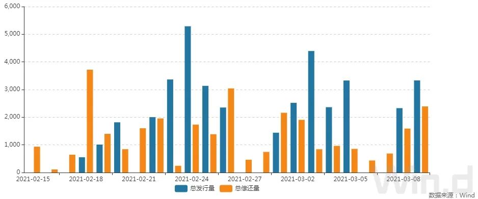 3月9日,债券市场共发行260只债券,总发行量3330.67亿元,185只债券到期,20只债券提前兑付,无债券回售,无债券赎回,总偿还量2390.36亿元,当日净融资额为940.31亿元。