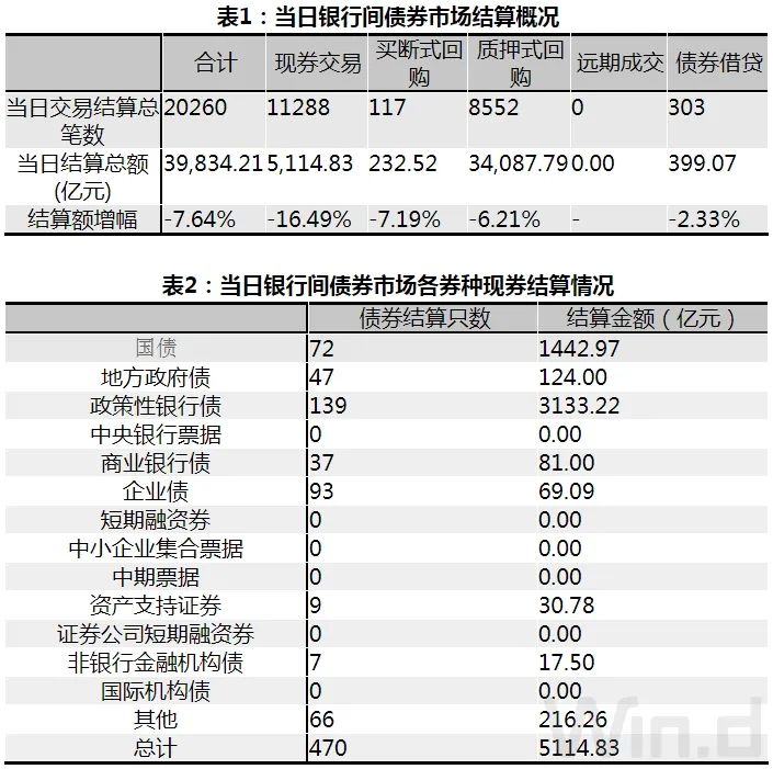 3月9日(周二),全国银行间债券市场结算总量为39,834.21亿元,较上日减少7.64%,交易结算总笔数为20260笔。其中,质押式回购34,087.79亿元,买断式回购232.52亿元,现券交易5,114.83亿元,债券借贷399.07亿元。银行间债券市场回购利率涨跌互现,其中隔夜回购利率上行28.3bp至2.011%,3天回购利率下行9.5bp至2.057%。