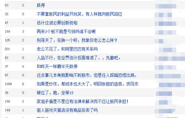 由于股价大跌,丽人丽妆投资者不淡定了,股吧瞬间炸锅。