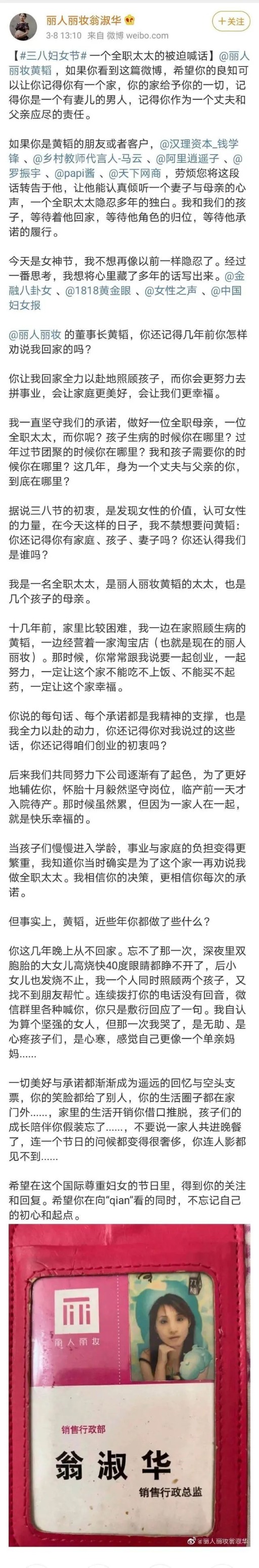 曾是丽人丽妆001号员工,如今身为全职太太的翁淑华在新浪微博上“被迫喊话”寻找她的丈夫——现任丽人丽妆董事长黄韬。