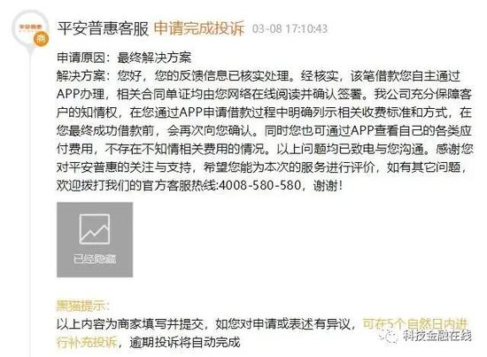 金融虎注意到,3月8日,平安普惠官方客服在最新回复的用户投诉中称:“您的反馈信息已核实处理。经核实,该笔借款您自主通过APP办理,相关合同单证均由您网络在线阅读并确认签署。我公司充分保障客户的知情权,在您通过APP申请借款过程中明确列示相关收费标准和方式,在您最终成功借款前,会再次向您确认。同时您也可通过APP查看自己的各类应付费用,不存在不知情相关费用的情况。以上问题均已致电与您沟通。”。