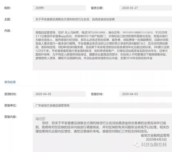 据金融虎此前报道,去年4月3日,针对消费者实名投诉“平安普惠及其联合方高利转贷巧立名目,抬高资金综合息费”一事,广东省地方金融监督管理局也曾在回复中表示,将对用户反映的投诉内容进行调查核实,并对反映的有关问题依法依规予以处理。