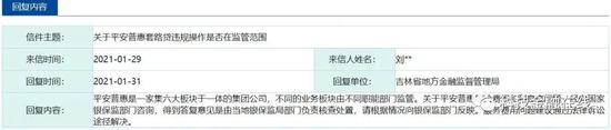 金融虎注意到,今年1月末,吉林省地方金融监督管理局在诸多用户的有关投诉中指出:“关于平安普惠保险费用和利息高问题,是由当地银保监局部门负责核查处置,可根据情况向银保监部门反映。服务费用问题建议通过法律诉讼途径解决。”。